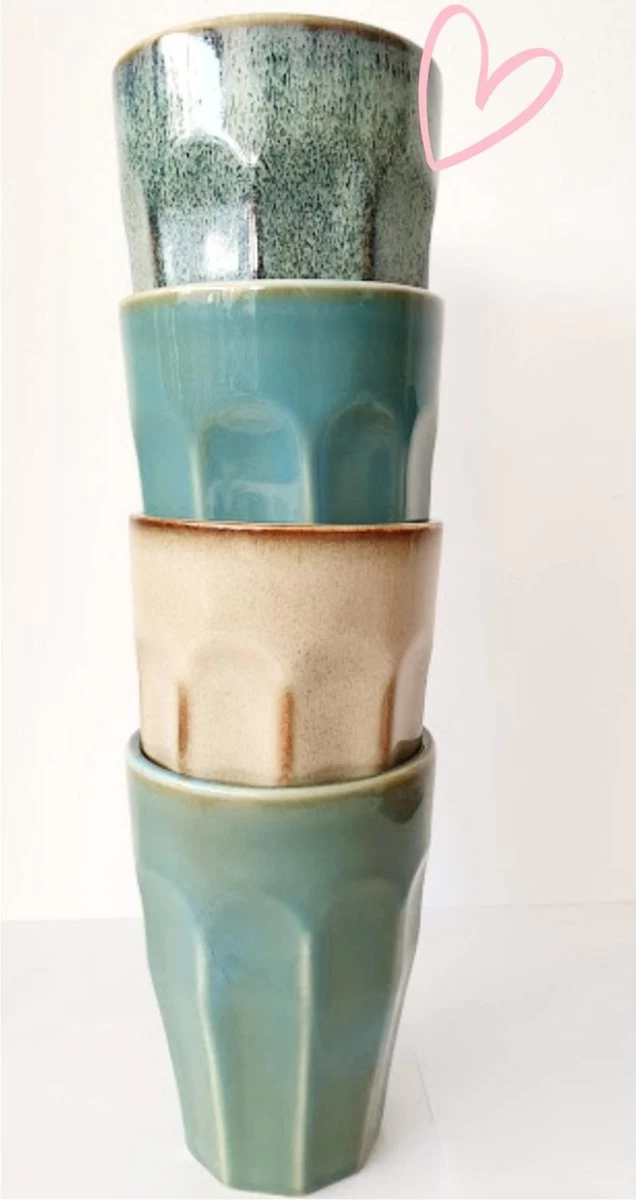 Kitchen Trend Latte Macchiatobekers in een set van 4 stuks hebben een inhoud van 330 ml, zijn gemaakt van aardewerk in blauwtinten en gebruikt u voor het drinken van zowel warme als koude dranken, bijvoorbeeld koffie. Geschikt voor gebruik in de oven en magnetron.